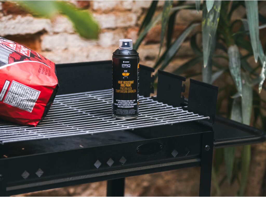 Sobald die Oberfläche sauber, trocken und rostfrei ist, kannst du mit der eigentlichen Reparatur beginnen. Für Lack- und Rostschäden an Grills eignet sich spezielles Lackspray. Das A und O dabei ist, unbedingt auf die Hitzebeständigkeit des Lacks zu achten. Handelsübliche Lacksprays sind nicht für die hohen Temperaturen eines Grills ausgelegt und würden abplatzen, sich verfärben oder sogar schädliche Dämpfe freisetzen.