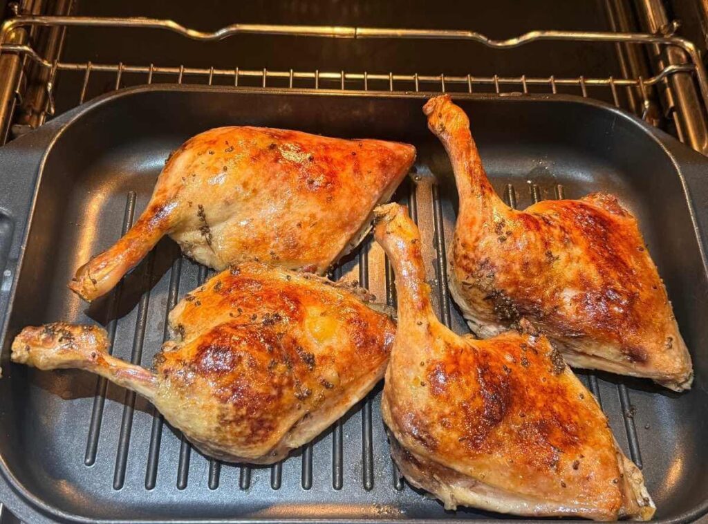 - Knusprig braten: Nach insgesamt etwa 75 Minuten Bratzeit bei 180 °C stellen Sie den Ofen auf die Grillfunktion bei 250 °C. Braten Sie die Ente für weitere ca. 15 Minuten, bis die Haut goldbraun und knusprig ist. Bleiben Sie unbedingt dabei, um ein Verbrennen zu vermeiden.