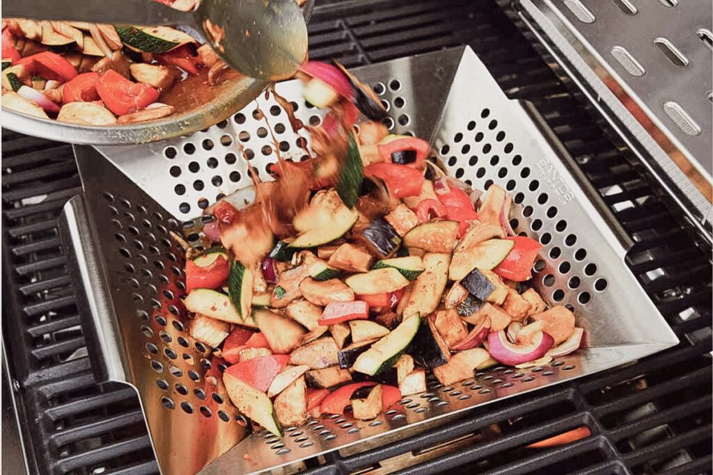 Verwenden Sie eine spezielle Grillpfanne oder eine robuste Gusseisenpfanne, die für den Grill geeignet ist. Alternativ können Sie das Gemüse auch in einer Alufolie-Packung garen. Erhitzen Sie die Pfanne auf mittlerer Hitze, bevor Sie das Gemüse hineingeben. Das Gemüse sollte unter gelegentlichem Rühren garen, bis es bissfest und leicht gebräunt ist.