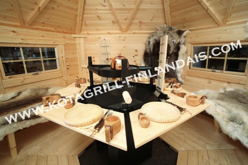 Ein finnischer Kota Grill ist eine traditionelle, runde Holzkonstruktion aus Lappland, die als gemütlicher Schutzraum für ganzjähriges Grillen und geselliges Beisammensein dient. Er verfügt über eine zentrale Feuerstelle und umlaufende Sitzbänke.