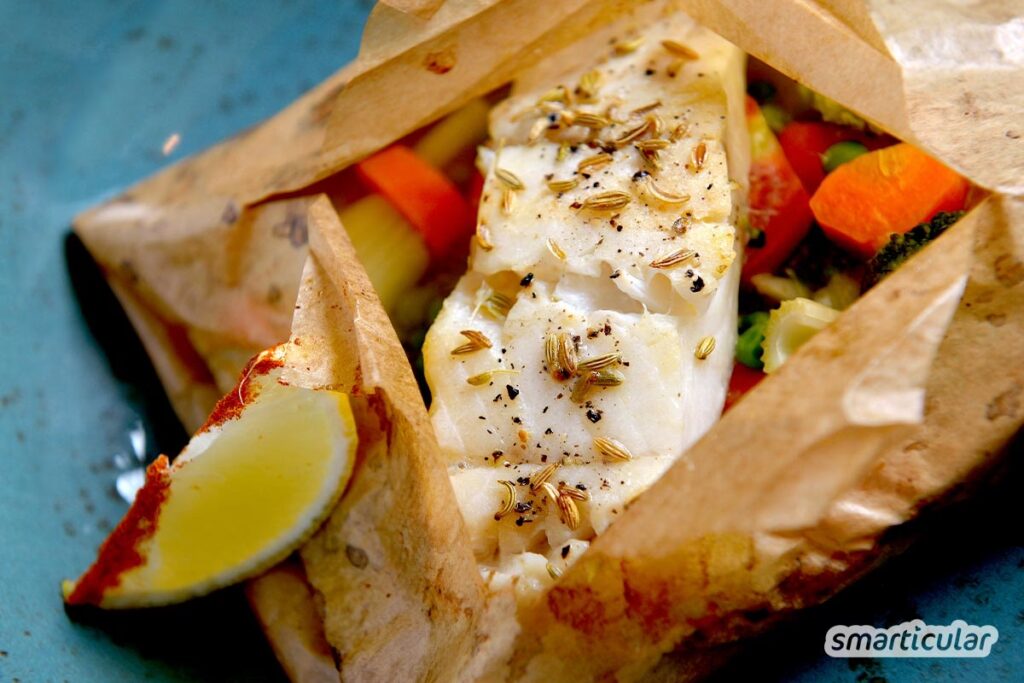 - Back-, Pergament- oder Butterbrotpapier: Diese Papiere sind zwar ebenfalls Einwegprodukte, haben aber eine deutlich bessere Umweltbilanz als Alufolie, da sie in der Regel biologisch abbaubar oder recycelbar sind. Sie eignen sich gut zum Einwickeln von Sandwiches, Gebäck oder zum Auslegen von Backblechen.