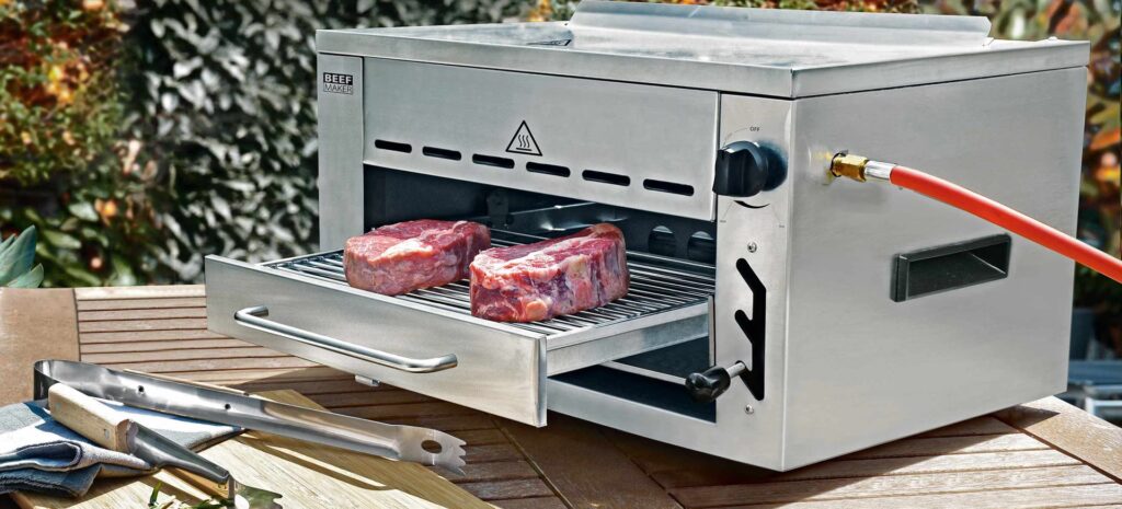 Ein typischer Oberhitzegrill, wie der Beefer, lässt sich am besten als eine kompakte Metallbox beschreiben. Meist sind sie vorne schmal und nach hinten hin tiefer. Drei der vier Seitenwände sind geschlossen, oft mit Lüftungsschlitzen versehen, um einen kontrollierten Hitzestau zu ermöglichen und gleichzeitig überschüssige Wärme abzuleiten. Die Vorderseite bleibt offen, um den Grillrost samt Grillgut bequem einschieben und entnehmen zu können.