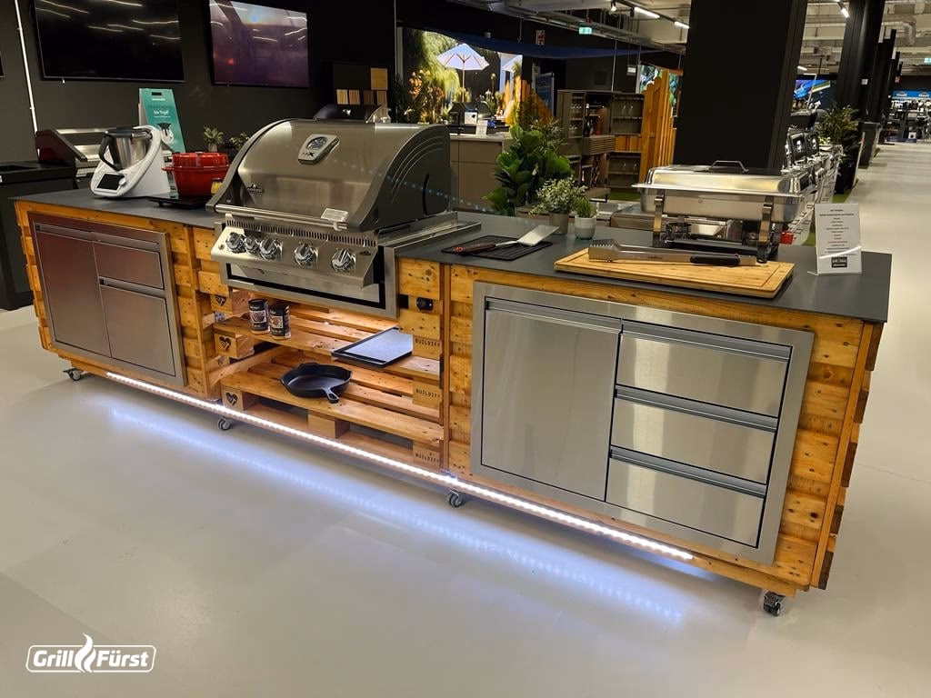 | Materialien | Holz (Paletten), Holz-Arbeitsplatte | Edelstahl, Granit, Beton, spezielle Outdoor-Hölzer |