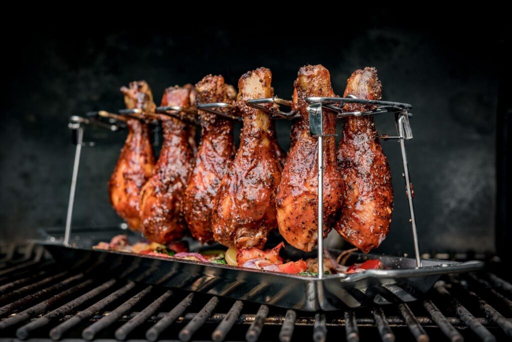 Ein Fischhalter verhindert das Anhaften und Zerfallen empfindlicher Fische auf dem Rost. Ein Bratenkorb oder Hähnchenhalter sorgt für eine gleichmäßige Bräunung und Garen von Geflügel oder größeren Fleischstücken.