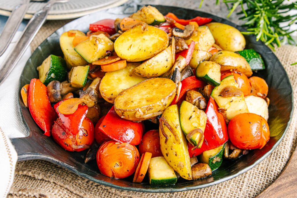 - Regelmäßiges Wenden: Wenden Sie das Gemüse und die Kartoffeln regelmäßig in der Pfanne, um sicherzustellen, dass alle Seiten gleichmäßig garen und eine schöne Bräunung erhalten.