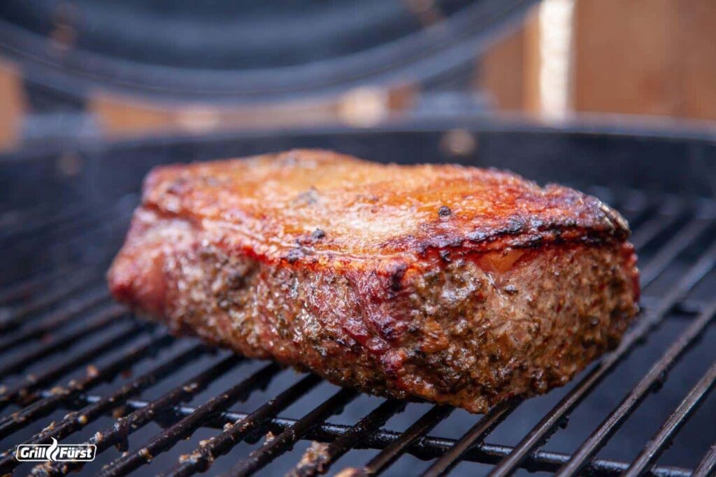 Legen Sie das Roastbeef zunächst für etwa 2-3 Minuten pro Seite auf die direkte Hitzezone, um eine schöne Kruste zu erzeugen (Maillard-Reaktion). Dies verleiht dem Fleisch nicht nur ein appetitliches Aussehen, sondern auch zusätzliche Röstaromen. Achten Sie darauf, dass das Fleisch nicht verbrennt. Sobald alle Seiten scharf angebraten sind, legen Sie das Roastbeef auf die indirekte Hitzezone, direkt über die Auffangschale.