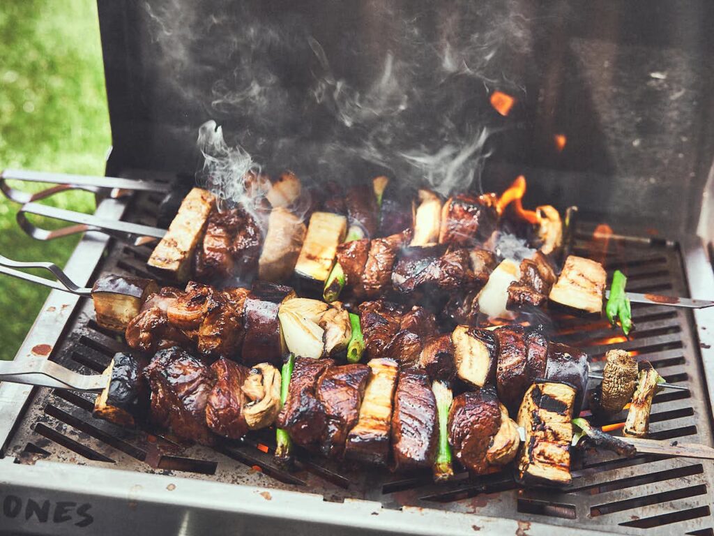 - Spieße nicht überladen: Lassen Sie zwischen den Stücken auf dem Spieß etwas Platz, damit die Hitze zirkulieren kann und alles gleichmäßig gart.