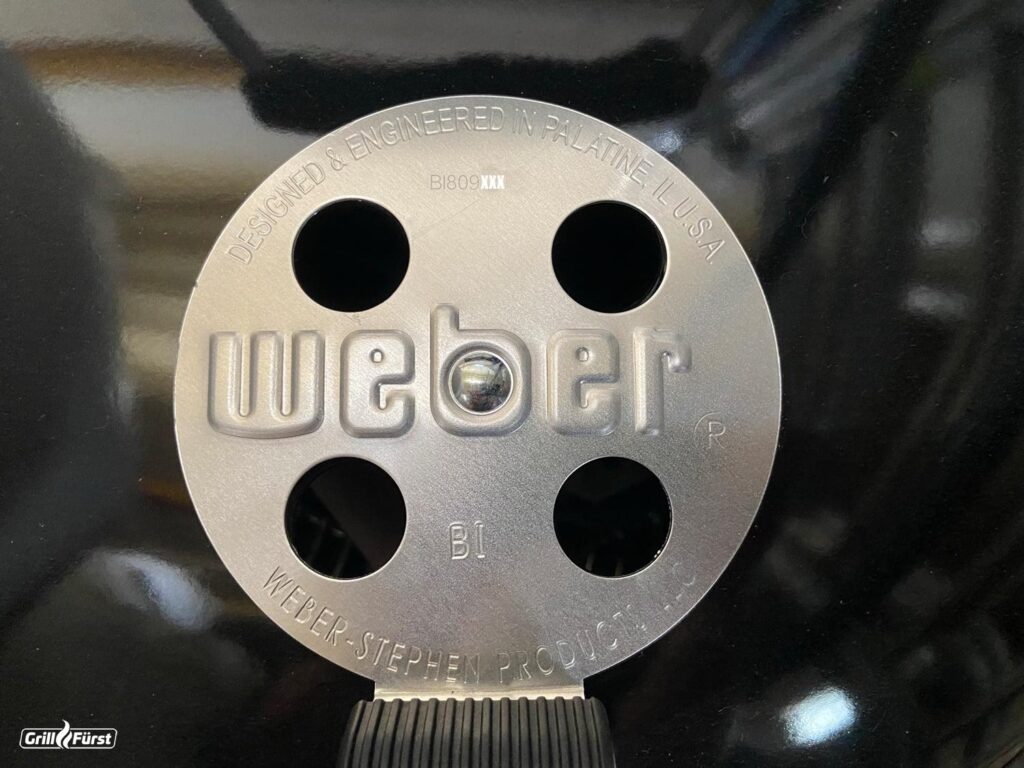 - Neuere Modelle (Produktion ab 2013): Bei allen anderen, neueren Holzkohlegrill-Modellen ist die komplette Weber Grill Nummer am oberen Rand des Deckellüfters zu finden. Sie besteht aus den üblichen zwei Buchstaben und sieben Ziffern.