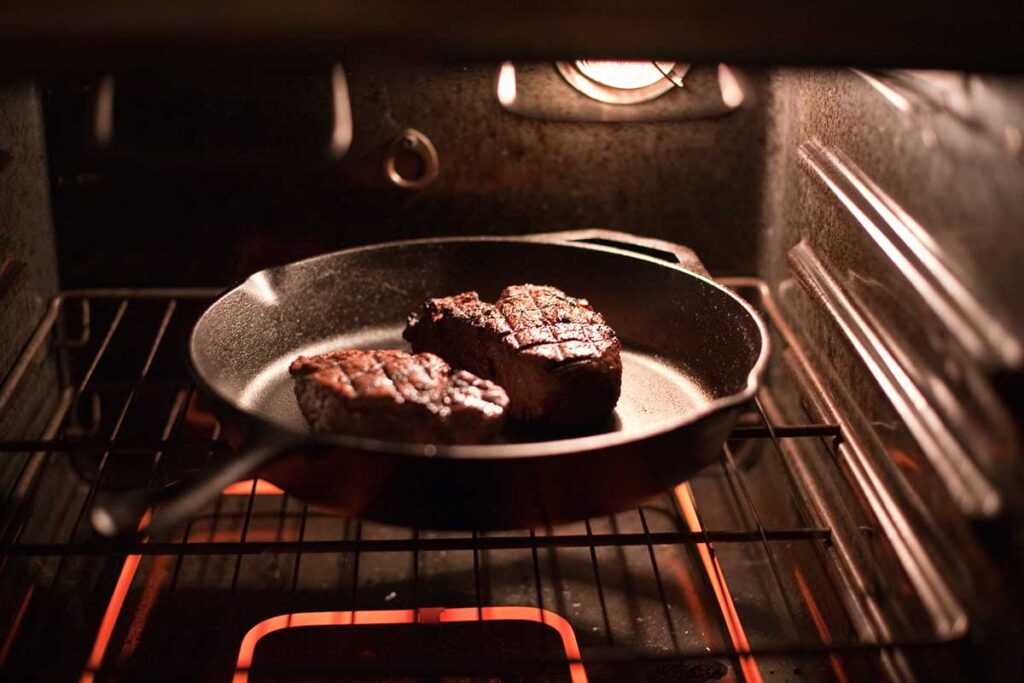 Nach dem scharfen Anbraten kommt das Steak in den vorgeheizten Backofen, wo es bei niedrigerer Temperatur fertig garen kann. Diese Methode sorgt für ein gleichmäßiges Garen im Inneren, während die Kruste erhalten bleibt.