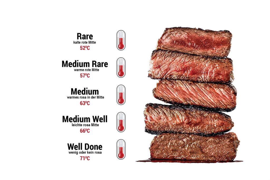 Die gewünschte Garstufe ist eine Frage des persönlichen Geschmacks. Ob blutig, rosa oder durch – mit der richtigen Kerntemperatur treffen Sie immer den Punkt. Beachten Sie, dass die Temperaturen Richtwerte sind und je nach Grill, Fleischqualität und individuellem Geschmack leicht variieren können.