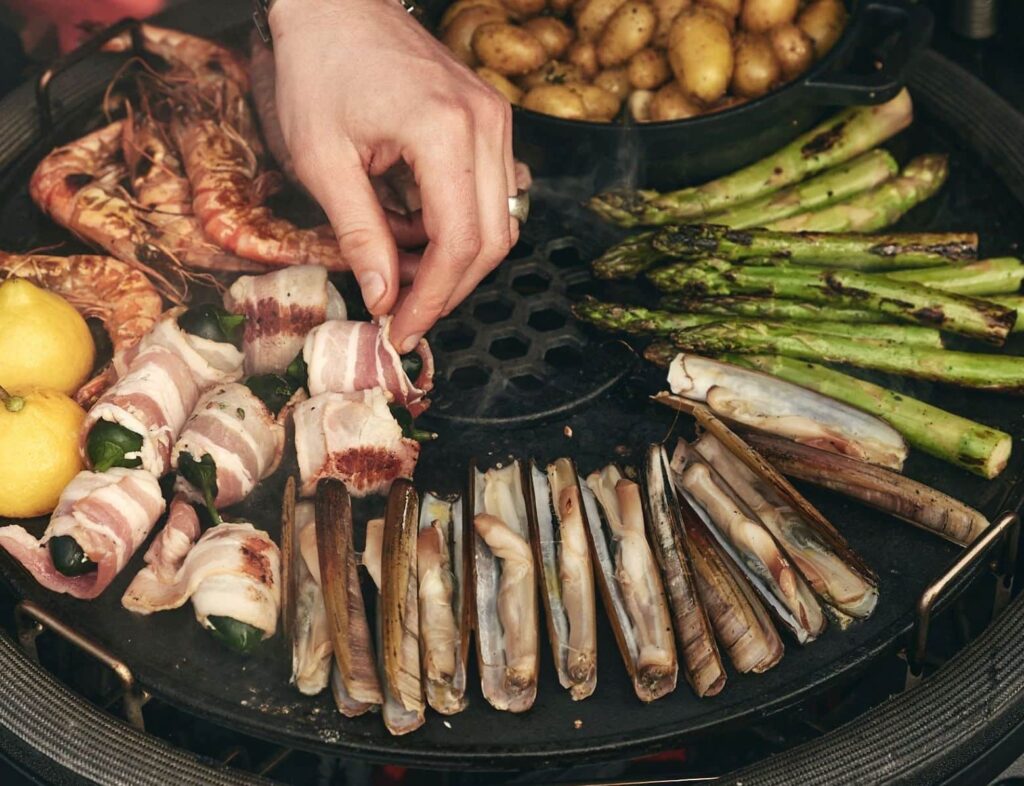 Eine der beliebtesten Methoden, Tapas zuzubereiten, ist die Nutzung einer Plancha. Eine Plancha ist eine flache Grillplatte, die einfach auf den Rost Ihres Grills gelegt wird. Sie ist ideal, um sowohl große als auch kleine Stücke Fleisch oder Gemüse gleichmäßig zu garen. Der große Vorteil einer Plancha liegt darin, dass sie einen Teil des aufsteigenden Rauches vom Grillgut fernhält. Dadurch schmecken Spieße, Grillfleisch und Brotscheiben „unverfälschter“ und weniger rauchig, was die feinen Nuancen der Zutaten besser zur Geltung bringt. Falls Sie keinen speziellen Plancha-Grill besitzen, kann auch eine Feuerplatte eine hervorragende Alternative sein. Sie bietet ebenfalls viel Platz, um verschiedene Tapas gleichzeitig zuzubereiten.