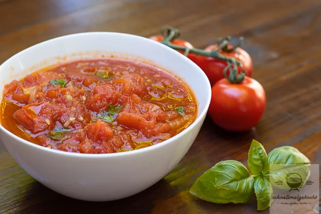 • Zutaten: 1 Dose (800g) geschälte Tomaten, 2 Knoblauchzehen, 1 kleine Zwiebel, 2 EL Olivenöl, 1 TL getrockneter Oregano, frischer Basilikum, Salz, Pfeffer, Prise Zucker.