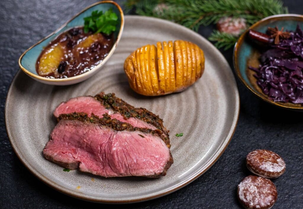 Roastbeef ist zudem sehr flexibel in der Zubereitung und kann je nach Vorliebe rare, medium oder well done gegart werden. Mit einem Kerntemperaturmesser behalten Sie stets die Kontrolle und erzielen ein perfektes Ergebnis. Dieses Gericht ist ideal für alle, die eine Abwechslung zu den traditionellen Weihnachtsbraten suchen und den intensiven Geschmack von gegrilltem Rindfleisch lieben.
